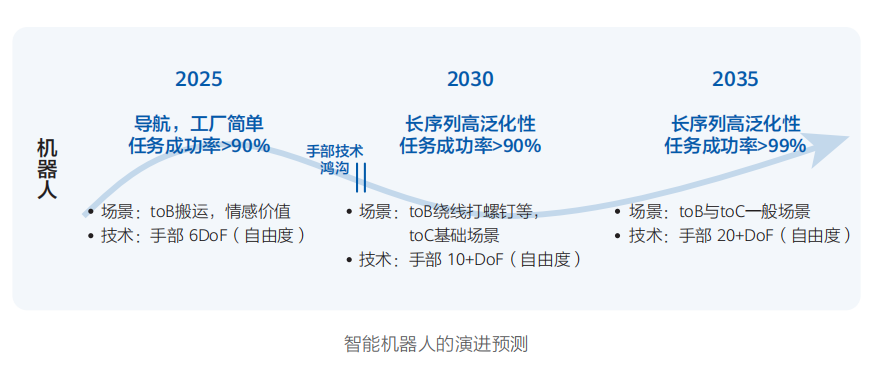 2035年前后,随着量产规模扩大,家庭机器人售价会低于1万美元,成本不再是制约机器人普及的关键因素,机器人产业将进入爆发期。