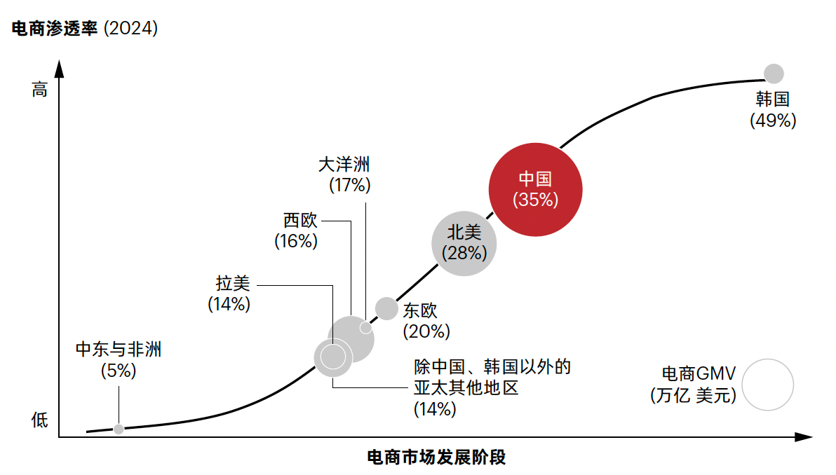 注:电商渗透率 = 电商渠道商品成交额(GMV)占整体GMV的比例;大洋洲包括澳大利亚和新西兰;仅统计B2C电商