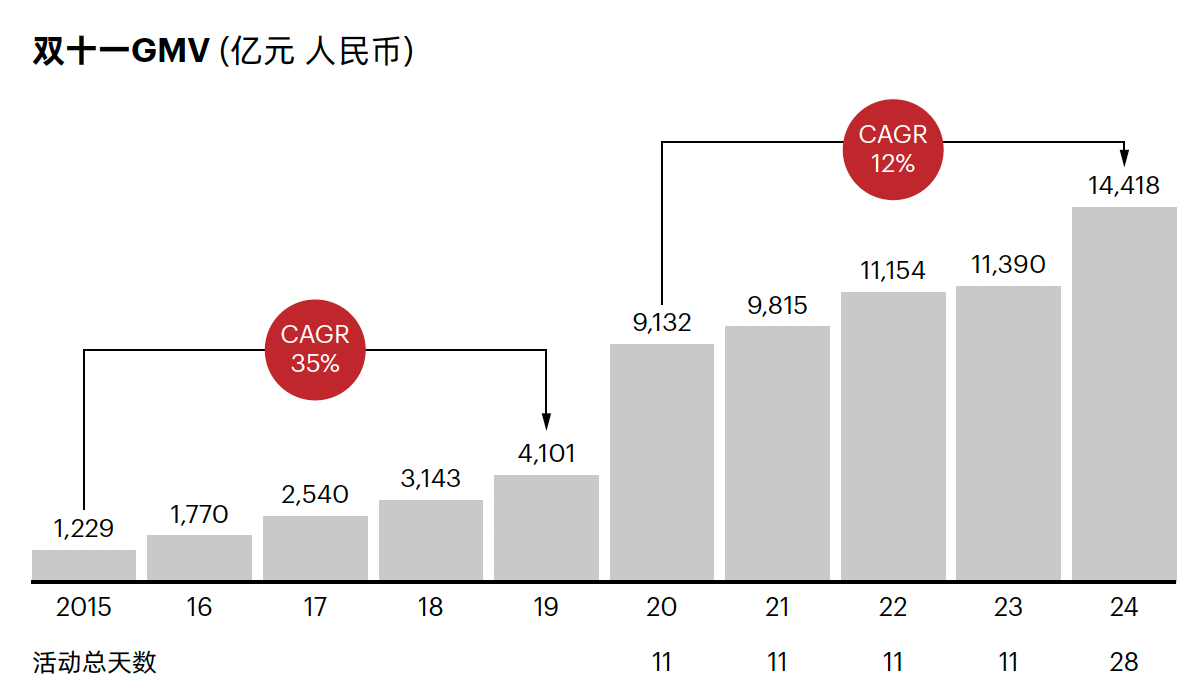 注:2014–19年数据仅包含11月11日单日销售额;2020–24年各个电商的购物节时长存在差异,本图数据来源于最大电商企业的促销日程安排;2021年调整GMV统计口径,将点淘数据排除在外,避免重复统计