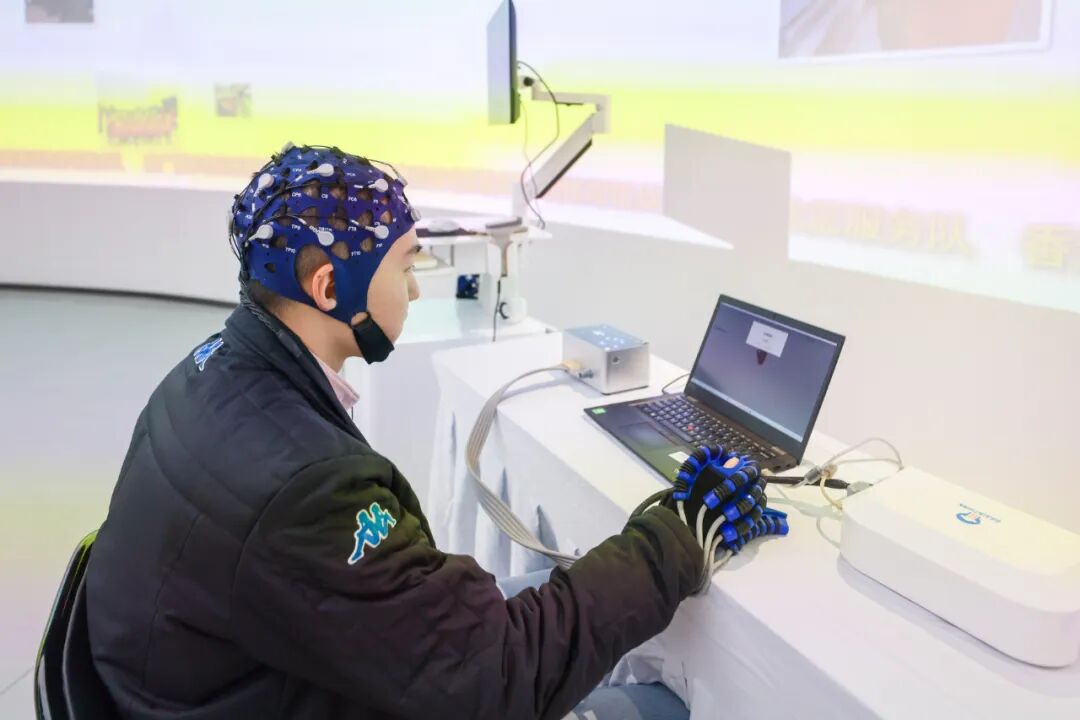 △图为北京市民正在体验脑机接口手部运动反馈康复训练系统。(图片由CNSPHOTO提供)