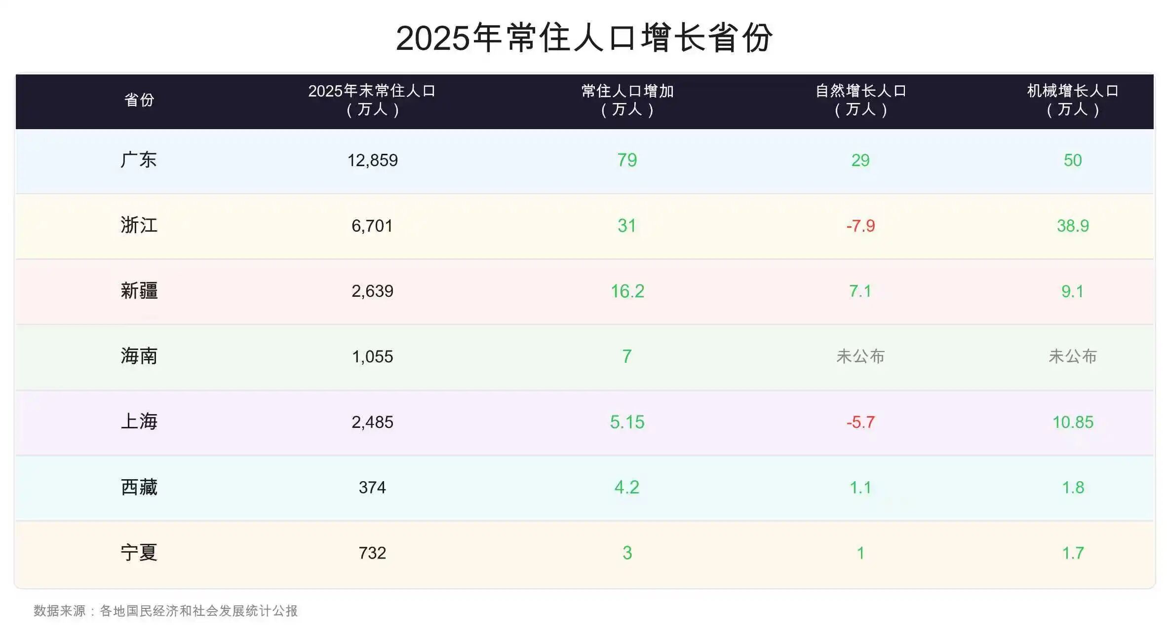在这份人口成绩单上,常住人口实现增长的7个省份最为亮眼。其中,广东以新增79万人的规模,继续稳居人口第一大省之位,总人口约1.28亿。其增长是“双轮驱动”的典型:全年出生人口100.3万,带来29万人的自然增长;同时,省外净流入人口约50万。