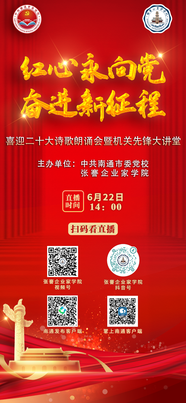 2022年6月22日14:00,由中共南通市委党校、张謇企业家学院联合主办的“红心永向党 奋进新征程”——喜迎二十大诗歌朗诵会暨机关先锋大讲堂活动,将通过张謇企业家学院抖音号和视频号、南通发布客户端、掌上南通客户端同步直播,敬请关注!