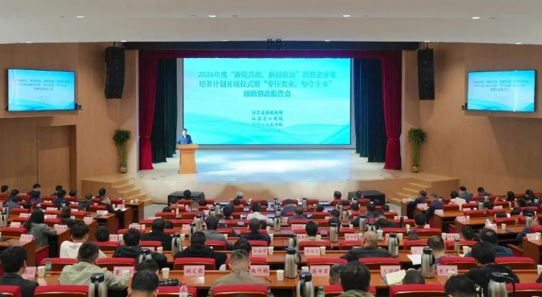 市委常委、市委统战部部长、张謇企业家学院院长王小红主持报告会。各设区市委统战部分管副部长、工商联党组书记,省委统战部、省工商联有关处室负责同志,2026年度“新锐苏商、新程致远”民营企业家培养计划全体学员参加活动。